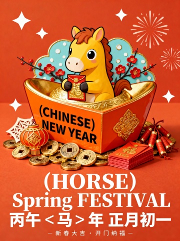 喜庆红金配色,中式剪影马形融合几何渐变,扁平风设计呈现2026年农历新年,鎏金文字增添节日质感。