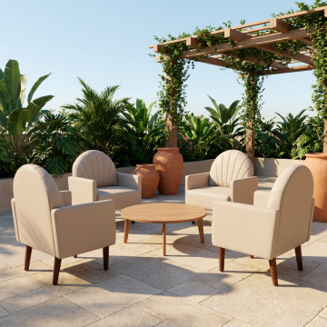 阳光明媚的花园露台餐厅,原木色方形餐桌搭配藤编靠背餐椅,桌面上摆放着白色陶瓷餐具和插满粉色玫瑰的玻璃花瓶,四周被茂密的绿植和盛开的花卉环绕,顶部悬挂着造型简约的白色布艺吊灯,地面铺设浅色防滑地砖,远处可见木质围栏和蓝天白云,整体呈现出清新自然、温馨舒适的田园风格,光线明亮柔和,营造出轻松愉悦的用餐氛围。