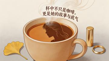 温馨插画风,拟人卡通女孩与真人共饮咖啡,营造节日般温暖氛围。