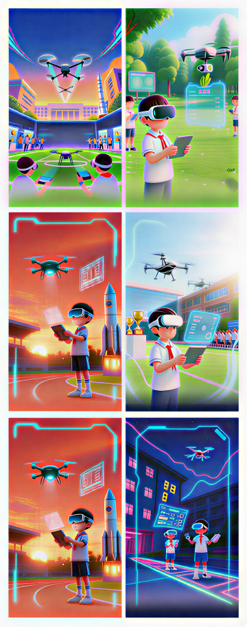 未来感3D教室,科技感十足的虚拟现实教学,卡通风格学生沉浸式学习。