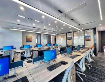 现代简约风格的办公室环境,开放式办公区布局,浅灰色与白色为主的中性色调,大面积落地玻璃窗引入明亮自然光,搭配白色条形吊灯和嵌入式筒灯提供均匀照明,灰色几何图案地毯覆盖地面,白色办公桌配深灰抽屉柜,黑色框架米色坐垫办公椅,办公桌间有半人高白色隔断,角落摆放大型绿植增添生机,金属与玻璃材质的百叶窗隔断,办公桌上配有笔记本电脑和黑色办公电话,整体空间干净整洁、通透开阔,光线充足柔和,营造出专业高效且舒适的工作氛围。