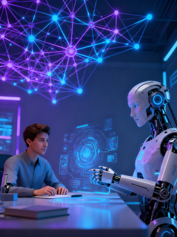 未来科技感十足的场景,深蓝色调为主,带有明亮的蓝白色发光元素,光影对比强烈,光线从机器人手指和笔记本屏幕散发出来形成光晕效果。一个人正在使用笔记本电脑,他的手放在键盘上,另一只半透明的机器人手从上方伸出,手指指向屏幕上的全息界面。周围悬浮着多个半透明的全息数据窗口,包含各种图表(折线图、柱状图、饼图)、仪表盘、圆形和方形的控制面板元素,界面线条流畅,带有科技感的蓝色发光边框。背景深邃模糊,突出前景的手部、笔记本和全息元素,整体营造出高科技、数字化、未来感的氛围,具有清晰的视觉层次,主体元素突出,细节丰富,画面具有电影感的景深和质感。