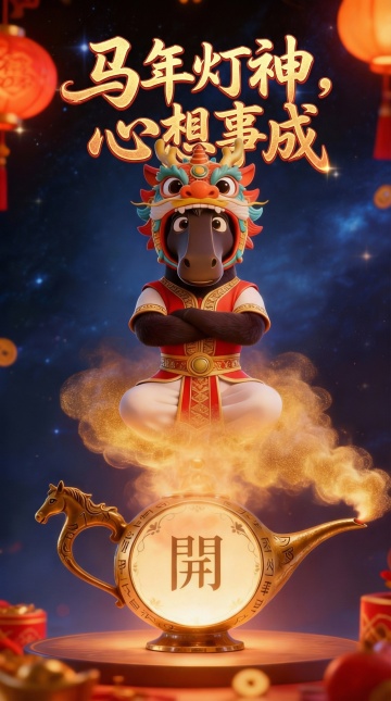 3D卡通马年灯神,舞龙头套+阿拉丁灯神服饰,鎏金神灯粒子环绕,喜庆梦幻,寓意心想事成。
