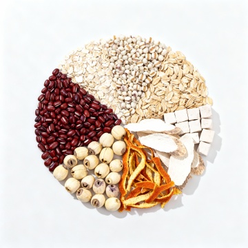 一张富有创意的商业产品摄影图,纯正俯视视角,画面左半部分,呈半扇形地摆放着8种天然食材,有赤小豆、薏苡仁、燕麦片、莲子、芡实、茯苓、新鲜的山药片、橘皮。画面光线明亮柔和,色彩自然,食材的质感真实,构图干净且富有设计感,高清细节,背景方便抠图
