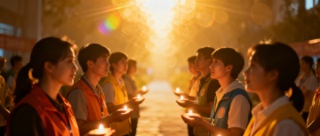 广角俯拍视角,现代化中学体育场的黄昏全景,深红色塑胶跑道在夕阳下泛着温暖光泽,六道白色分道线如钢琴键般延伸至画面深处,弯道处有几个穿着蓝白校服的学生正在进行变速跑训练,他们的影子被拉得很长。跑道内侧是修剪整齐的深绿色人工草坪,几名女生正围坐成圈进行拉伸运动。左侧的灰色看台坐满了观看校际足球赛的学生,他们挥动着蓝白相间的校旗,遮阳棚的金属结构在暮色中投下几何形状的阴影。背景中五层米色教学楼的窗户透出温暖的灯光,与远处渐变成粉紫色的天空形成柔美过渡,几棵高大的梧桐树在微风中摇曳,将斑驳的影子投射在跑道上。空气中弥漫着青草和塑胶的混合气味,远处传来操场广播里播放的轻音乐和学生们的欢呼声,整体色调从橙红向靛蓝渐变,营造出既充满运动活力又带着青春黄昏特有的温馨氛围。