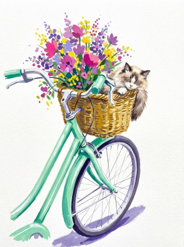 水彩风插画,白猫戴红蝴蝶结坐于花丛,拟人化设计,清新梦幻,传递春日温暖与童趣。