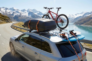 广角仰拍视角,一辆亮红色豪华SUV以富有力量感的45度角从画面左下角向右上方疾驰,流线型车身在阳光下反射出耀眼的金属光泽,22英寸多辐式轮毂裹挟着黑色柏油路面的动感模糊,扬起细微的碎石与胎痕。背景是玻璃幕墙林立的现代化都市天际线,摩天大楼的几何轮廓在由深邃钴蓝渐变为清澈天蓝的晴朗天空下显得格外挺拔,几缕被夕阳染成金边的白色云彩横向舒展。柔和的侧逆光勾勒出汽车锐利的腰线与车顶行李架,前大灯投射出两道明亮的光柱穿透空气中的微尘,地面倒影呈现出拉伸的红色光带。右下角保留空白区域,底部左侧虚化处理的路面细节隐约可见,整体构图遵循三分法则,以红与蓝的强烈对比展现速度与优雅的完美融合,光影层次分明,突出车辆的豪华质感与动态力量。