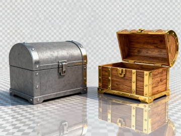 一套6张的系列素材集合,每张素材均为规整排布的单一宝箱元素图案,宝箱采用明亮的金色金属边框与红色木质箱体的经典配色,带有圆形铆钉装饰和精致锁扣,呈现出打开或关闭等不同形态,打开的宝箱内部盛满闪耀的金币和紫色菱形宝石,金币和宝石散落于宝箱周围,整体造型简约现代,具有卡通风格的立体感和光泽感,高光和阴影处理细腻,背景为纯白色,无任何文字、logo或水印。