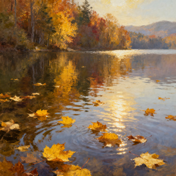 厚涂风油画,融合印象画派笔触,梦幻光影交织于静谧湖畔,唯美的秋日森林倒映水中,浪漫而文艺。