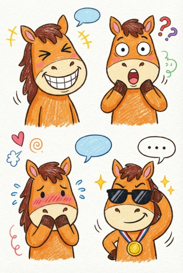 蜡笔风插画,拟人化小马展现四种趣味表情,搭配描边与对话气泡,充满可爱与卡通感,适合节日贺图。