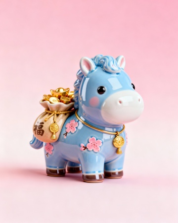 软3D风蓝色小马,釉面质感搭配国潮樱花元素,背负金元宝福袋,金属风配饰点缀,萌趣喜庆,节日氛围满满。