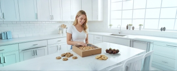 一个明亮整洁的现代厨房,采用简约优雅的设计风格,以白色为主色调,搭配黄铜色金属装饰细节。厨房整体呈现出温馨舒适的氛围,阳光透过百叶窗洒入,在白色橱柜和大理石台面上形成柔和的光影效果。白色的橱柜带有黄铜色的圆形拉手,上方的吊柜和下方的地柜组合提供了充足的储物空间。大理石台面光滑洁净,带有自然的灰色纹理。台面上有一个双槽不锈钢水槽,搭配黄铜色的水龙头。水槽旁边的金属桶里插着木质的锅铲和汤勺。墙面安装着黄铜色的挂杆,上面挂着各种木质和金属材质的厨房用具,包括勺子、铲子等。挂杆上方的白色搁板上摆放着不锈钢和玻璃材质的储物罐,里面装着各种香料和食材。台面上还摆放着一个白色的盘子,里面放着几块叠在一起的三明治,旁边还有一盘色彩鲜艳的沙拉。整体构图采用了三分法,光线从左侧窗户进入,营造出明亮通透的感觉,细节丰富,质感细腻,展现出干净利落的现代厨房设计感。