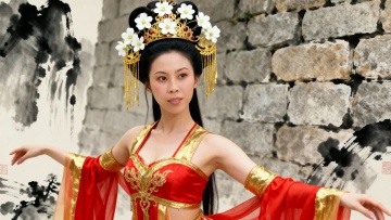 梦幻唯美的中式古典美人,身着红金华服于云海山巅翩然起舞,3D虚拟现实风格融合粒子飘散与光影流动,浪漫意境跃然眼前。