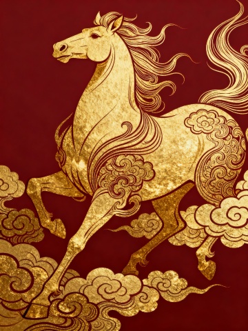 鎏金浮雕风骏马踏云,工笔描边勾勒古典韵味,红金配色尽显中式奢华与民族优雅,唯美复古中透出祥瑞之气。