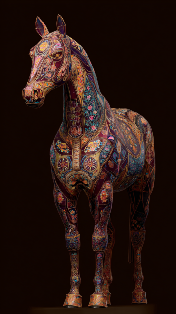 3D重拟物风马形雕塑,融合刺绣风与鎏金风,极繁主义中式图案交织,呈现奢华梦幻的神秘古典美感。