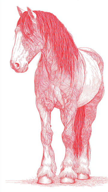 红白交织的线条勾勒出骏马的优雅轮廓,毛发生长风与白描技法结合,呈现唯美文艺的插画风格,单色设计彰显静谧诗意。