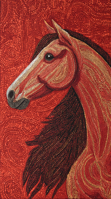 点彩与粒子交织的插画风马头,融合民族感与抽象肌理,红色基调营造热烈视觉氛围,体积感十足,展现独特视觉风格。