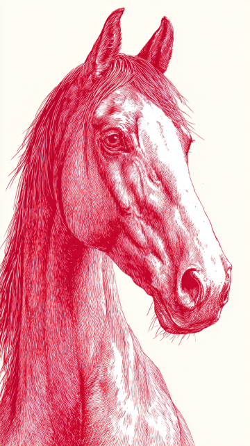复古感与古典感交融,以工笔风勾勒骏马轮廓,版画风线条细腻,浮雕质感凸显力量与优雅,红色背景呼应春节喜庆氛围。