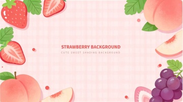 一套四个不同水果的插画,每个水果都有柔和的渐变色彩和半透明效果,风格保持一致。第一个是粉红色的草莓,带有绿色的叶子和白色的种子;第二个是橙色的橙子,带有绿色的叶子;第三个是黄色的香蕉,带有棕色的斑点;第四个是紫色的葡萄,成串排列。所有水果都位于纯色背景上,整体色彩变换但保持协调,元素类目不变,规整排布成系列素材集合。