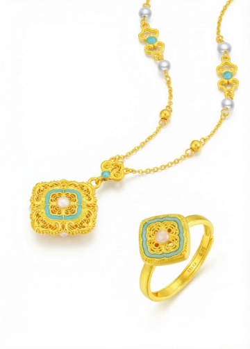 六款同系列黄金首饰在纯白色背景上呈规整排布,保持高分辨率3D渲染的写实风格,展现出一致的金黄色泽、细腻的金属质感、精致的镂空雕花工艺以及柔和的高光与阴影效果。每件首饰均具有光滑的表面处理和精湛的细节刻画:包括一款镶嵌圆形宝石的花朵造型吊坠项链、一对镂空藤蔓花纹的耳环、一枚带有几何纹路的戒指、一条简约光面的手链、一个精致的蝴蝶结造型胸针以及一款复古钱币设计的吊坠,整体构图清晰,突出黄金材质的奢华感与首饰的立体感。