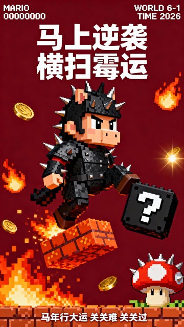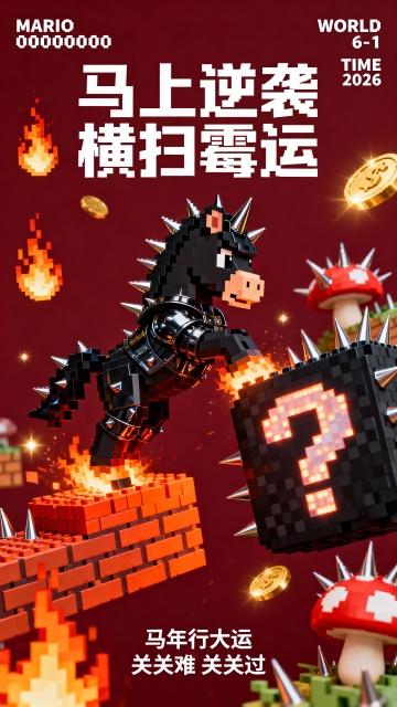 像素复古游戏风,战甲小马与火焰、带刺蘑菇等闯关元素结合,红黑撞色,营造酷飒逆袭的马年开运氛围。