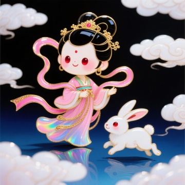 可爱感与梦幻感交织的中式插画风,描边与软3D结合,鎏金细节点缀,玻璃质感云朵环绕,兔儿相伴,中秋意境跃然眼前。