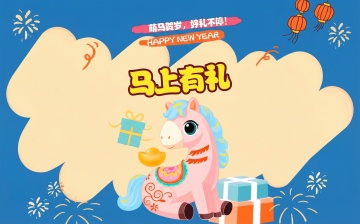 可爱卡通飞马跃动云间,梦幻彩虹映衬鎏金“马上来财”,软3D插画风满载新春祝福。