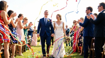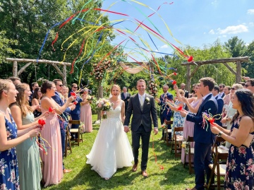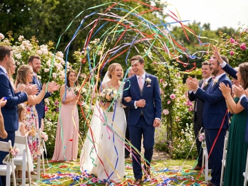 一对新婚夫妇的浪漫背影,新娘穿着优雅的白色露肩婚纱,裙摆宽大蓬松,手中捧着白色花束,新郎穿着黑色西装,温柔地从身后环抱着新娘,两人脸颊相贴,背景是一个装饰着大量白色和淡粉色玫瑰花的黑色金属拱门,周围是茂密的绿色松树和灌木丛,地面散落着花瓣,整体呈现出自然柔和的户外婚礼氛围,光线明亮柔和,色彩清新自然,构图聚焦于新人的亲密姿态与精致的婚礼场景细节。
