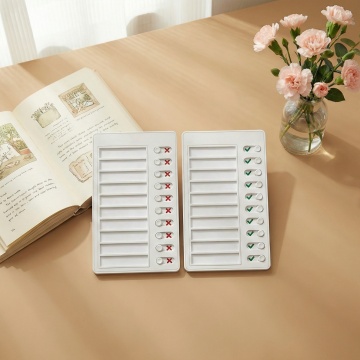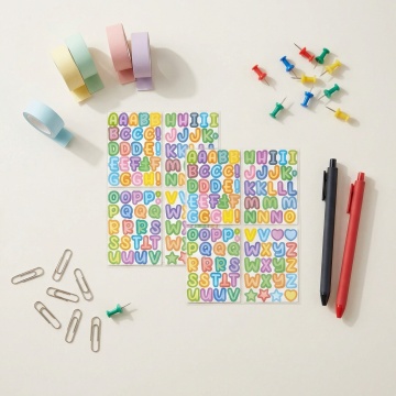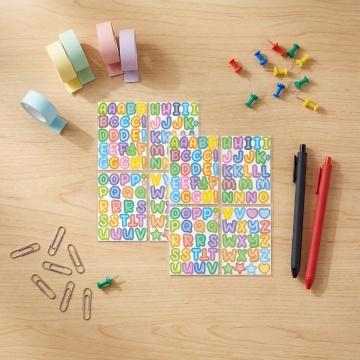 一套四格插画,每格均为纯色背景,保持手绘儿童插画风格,线条圆润流畅,色彩明快柔和,带有黄色星星装饰元素。第一格:蓝色背景,红色书包和黄色书本;第二格:绿色背景,橙色铅笔盒和紫色蜡笔;第三格:黄色背景,粉色剪刀和蓝色尺子;第四格:紫色背景,绿色橡皮和红色卷笔刀。所有物品造型卡通化,边缘有白色高光,整体排布规整对称。