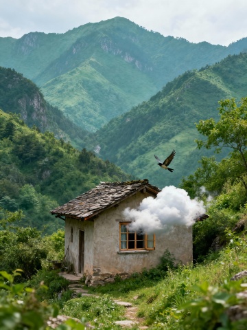鸟向檐上飞,云从窗里出