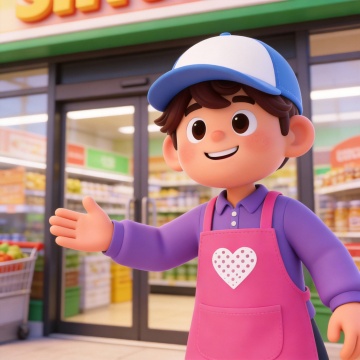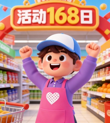 软3D风格卡通人物推满购物车,商场环绕促销彩带与折扣标签,拟人化设计充满喜庆与促销感,塑料质感强化视觉冲击,营造节日购物狂欢氛围。