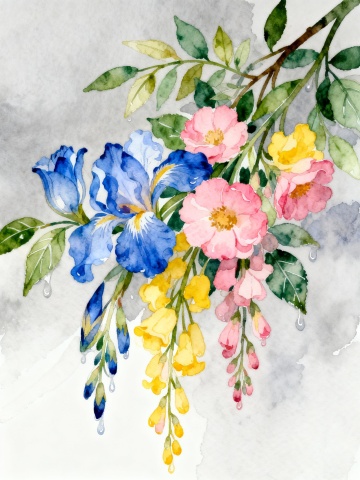 水彩风格插画,以纯净的白色为背景,右下角区域分布着大小不一、形态自然的花朵和花瓣,保持水彩特有的透明晕染质感、柔和的边缘过渡以及轻盈通透的笔触特征,整体构图呈现出自然散落的视觉效果,营造出清新、浪漫、飘逸的氛围,将原有的粉色系花朵和花瓣改变为纯净的蓝色系,从浅蓝到深蓝的渐变层次丰富,保持与原图一致的水彩晕染效果和轻盈感