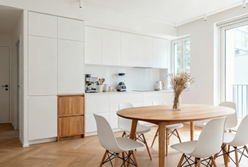 现代简约风格厨房内部场景,整体保持原图厨房样式布局,灰色大理石台面搭配白色与深灰色组合橱柜,黑色大理石纹理 backsplash 后墙,台面左侧放置黑色碗碟内有红黄梨子和苹果,背景操作台摆放绿色盆栽、木质砧板、白色花瓶及各类厨房小家电,嵌入式条形暖光照明从橱柜底部投射营造温馨氛围,光线柔和自然,空间层次分明,材质细节清晰,具有北欧极简设计感。