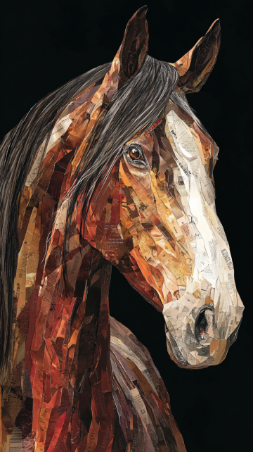 复古感撕纸风拼贴马头,立体主义构图,层次丰富,暗黑背景衬托质感。