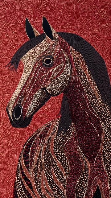 民族感浓郁的插画风马头肖像,融合点彩与岩彩技法,抽象线条勾勒出神秘图腾,红黑主调呼应节日庆典氛围。