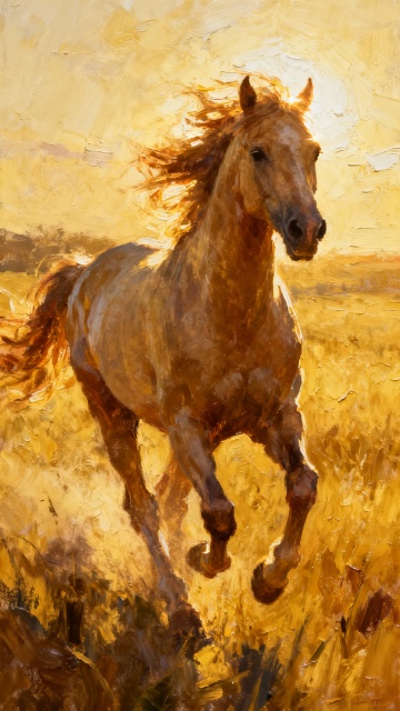 红底金饰的骏马,融合中式古典与鎏金风韵,厚涂技法呈现油画质感,插画风格尽显奢华与重拟物细节。