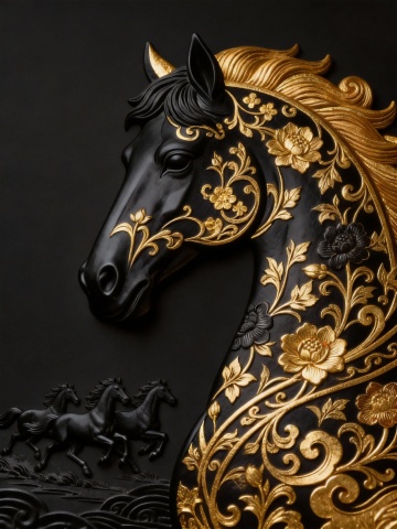 鎏金黑马跃然于古典纹饰之中,融合3D浮雕与重拟物风,极繁主义构图彰显奢华神圣感,中式美学与神秘气息交织,尽显东方神韵。