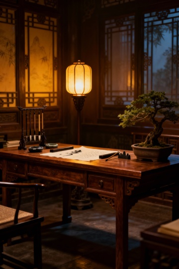 一张木纹桌面上,右侧放置着一个黑色镂空雕花屏风,屏风后有一盆绿色盆景,背景是柔和的暖黄色调,光线从左上角斜射过来,在粗糙质感的墙面上投下斑驳的光影,营造出宁静而古朴的氛围,环境变换为传统中式书房的角落,光线柔和温馨,整体风格统一且具有古典韵味。