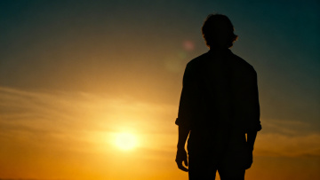 剪影风人物背影行走在夕阳下的乡间小路,胶片色调渲染实景感与光影层次,静谧中透出励志前行的力量。