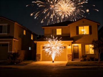 暖色光影交织,烟花绽放于庭院与夜空,实景氛围浓厚,粒子风效果营造喜庆节日感。