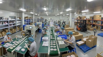 现代化工业场景,蓝色为主色调,清新明亮的光线,干净整洁的生产线,透明玻璃幕墙外是蓝天白云,绿色植物点缀在车间角落,机械臂精准运作,地面反光如镜,整体氛围充满科技感与希望