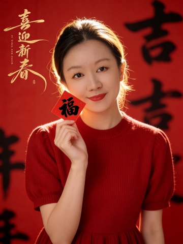 国潮风剪纸质感,鎏金书法“喜迎新春”跃然其上,光影交错间透出中式喜庆,红衣女子手持“福”字,温暖笑容传递新春祝福。