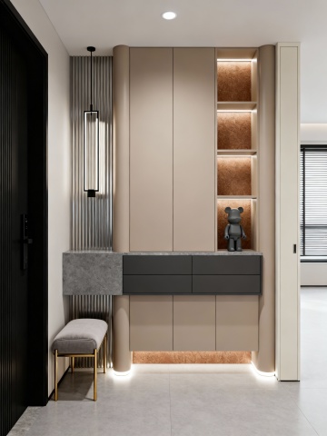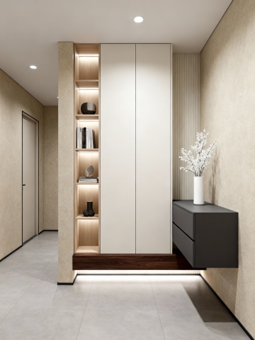 极简主义风格直播间背景,整体采用柔和的米白色与浅木色为主色调,营造出温馨、高级且宁静的氛围。墙面设计有流畅的弧形拱门造型,内嵌暖黄色灯带勾勒轮廓,底部铺设白色鹅卵石装饰带。地面为浅色木地板,呈人字形拼接图案,光感柔和自然。空间内有简约的浅木色圆形装饰镜挂于墙面,搭配白色弧形矮柜,矮柜底部为木质支撑腿。顶部安装嵌入式筒灯和轨道射灯,提供均匀且明亮的无阴影照明。光线呈现柔和的漫反射效果,明暗对比适中,整体构图注重对称与平衡,具有现代简约的设计感和舒适的视觉体验,适合作为展示或直播的纯净背景空间。