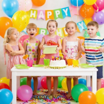 喜庆感十足的儿童生日派对,卡通风格与实景结合,轻拟物风装饰搭配拼贴元素,梦幻清新,充满欢乐氛围。