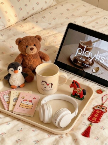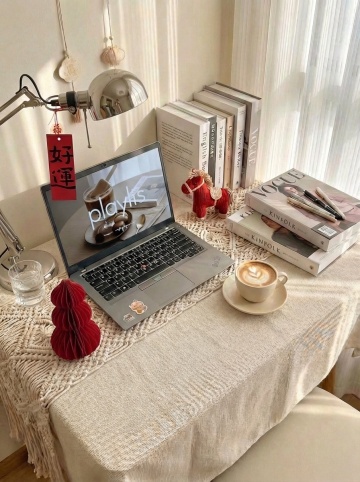 暖光下的书桌静物,融合杂志风与面料质感,红白点缀传递新年温馨