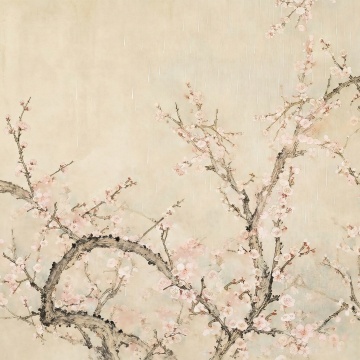 插画风与水彩风融合,柔和色调呈现春日清新感,扁平化设计增强舒适感,枝头梅花绽放,传递静谧节日氛围。