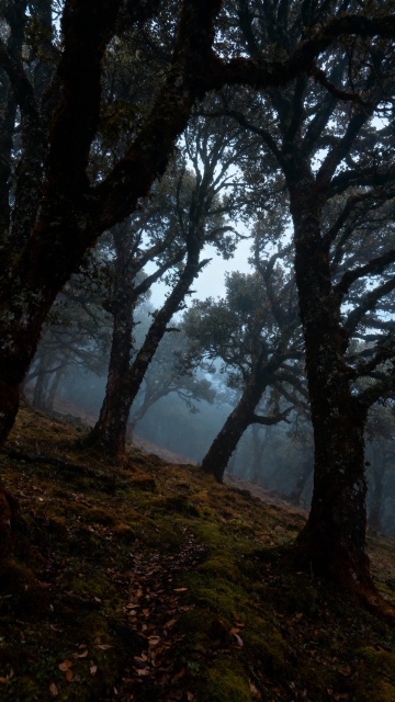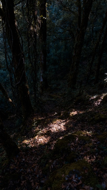 清晨森林内部,阳光穿透茂密树冠形成多束明亮光柱,照射在覆盖青苔的地面上,粗壮的树干林立,地面布满苔藓和岩石,一条蜿蜒小径延伸向深处,整体呈现写实风格,光线柔和,色彩以深绿和金色为主,光影对比明显,营造出神秘而宁静的氛围,变换布局使小径偏向一侧,增加更多低矮蕨类植物和散落的枯叶细节,树干纹理更加清晰,部分树干底部有斑驳光影。