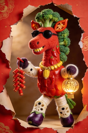 撕纸风破界而出,拟人化蔬菜马戴墨镜举灯笼,粘土质感融合国潮元素,喜庆卡通形象跃然眼前,趣味十足迎新春。