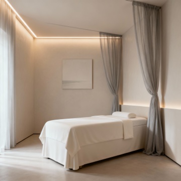极简主义风格室内设计,以浅灰色和米白色为主色调,大面积落地窗引入柔和自然光,光线在地面和墙面形成清晰的光影层次。浅灰色布艺沙发搭配同色系靠垫,线条简洁流畅,下方铺设浅米色条纹地毯,质感细腻。沙发旁是金属框架圆形小茶几,墙面设有简约的一字型置物架,摆放小型装饰画。整体空间布局遵循对称美学,注重留白,营造出宁静、通透、高级的氛围,地面采用大尺寸浅色瓷砖,接缝整齐,光脚触感舒适,窗外可见绿色植物,增添自然生机。