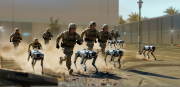 超写实3D渲染的科技感机器人,金属质感的黑色头部与银色躯干,蓝色发光眼睛与内部机械结构细节清晰可见,头部微微侧转,背景是深邃的蓝色渐变,布满流动的霓虹蓝色数据流线条与橙色、红色光点,左侧有巨大醒目的白色“AI”字样,整体光影效果强烈,高光与阴影对比鲜明,营造出未来感与科技氛围,画面聚焦机器人上半身,构图紧凑,充满视觉冲击力。
